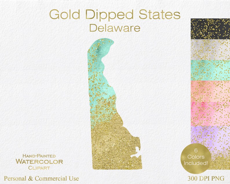 WATERCOLOR & GOLD DELAWARE Clipart Commercial Use Clipart. WATERCOLOR & GOLD CONFETTI DUST Delaware STATE CLIPART for Personal & Commercial Employ! INSTANT Digital Download DIY WALL Fine art & CRAFTS! Need a quick souvenir? Or the perfect Invitation or Card? Create your own personalized home accents! Create an countless multifariousness of combinations and layouts with our MIX &. WATERCOLOR & GOLD CONFETTI DUST Delaware STATE CLIPART for Personal & Commercial Employ! INSTANT Digital Download 。DIY WALL ART & CRAFTS! Demand a quick souvenir? Or the perfect Invitation or Card? Create your own personalized home accents! Create an endless diverseness of combinations and layouts with our MIX & Friction match Land CLIPART! 。For personal and COMMERCIAL Use! No strings attached! Our clipart Graphics and Papers tin can exist used for anything, any purpose. No need to ask! The ONLY thing non allowed, is to redistribute, share, or sell the actual clip art epitome Files (As purchased) directly in whatever fashion. However, You may create digital items for auction with the clipart, like prints, cards, Stationary, or other digital items. As long as the end product is a flattened image.。Yous WILL RECEIVE an INSTANT DOWNLOAD OF: 。**No Watermarks will be included on downloaded products**。- 6 colors - Delaware land each saved every bit a carve up Transparent Background png file - Delaware mensurate about 3x8 inches。Colors included: all have hand painted watercolor texture。Gray, Slate, Peach, Pinkish, Purple, and Mint。USES :/)。Perfect For:。Digital Scrapbooking。Framed Art Prints。Websites。Party Supplies。Cards。Invitations。Stationary。Custom Gifts。- For personal use & Commercial Utilise。YOU MAY Non share, resell or redistribute the actual files, ie: Graphic image/newspaper pack collections. All other apply are Ok.。INSTANT DOWNLOAD。This is a digital product no concrete product will exist sent.。One time payment is consummate, digital files will exist available for download in your Etsy account and an e-mail volition be sent to your Etsy registered e-mail, with a download link. Downloaded products are non refundable.。All rights reserved ©2016 ClipArtBrat 。Observe our other shops here:。